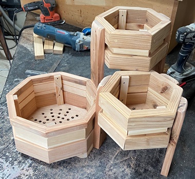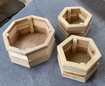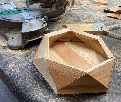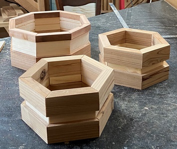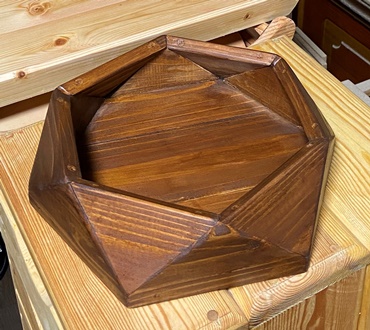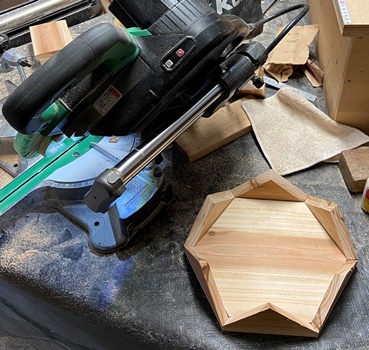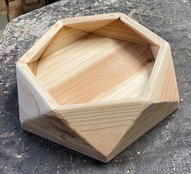 縁が内側に傾く六角深皿をやってみた。 一辺10cmの正六角形底面に、二等辺三角形を組み合わせてみたもの。 下側の二等辺三角形の斜辺を30°カットで内側に傾きを付ける。 挟み込んだ逆三角形の斜辺は15°カットでぴったり収まった。 長さ、角度がシビアで、ちょっと頭を悩ませる。 (「××木工研究所」の看板を掛けてしまってあるので、途中で放り出せずに頑張った。...(^^;))