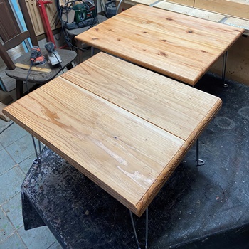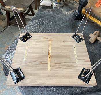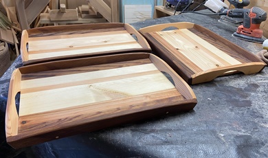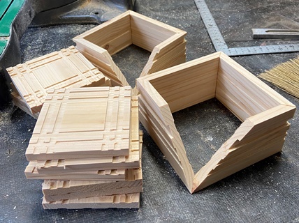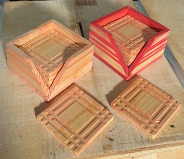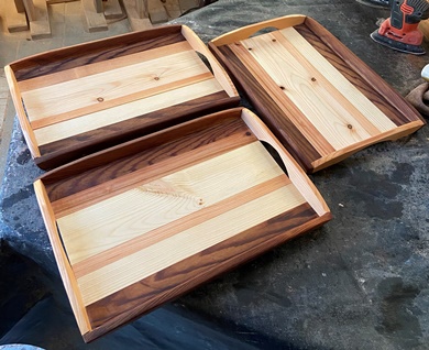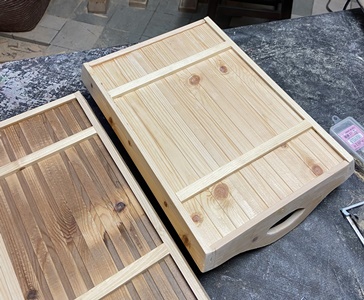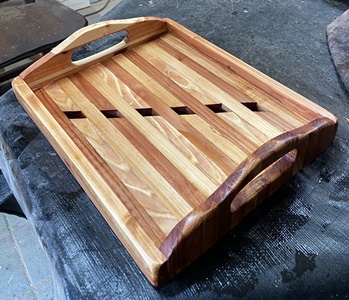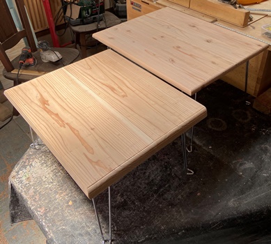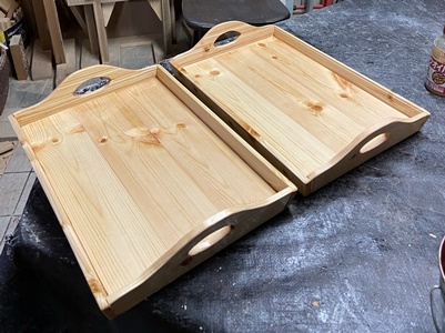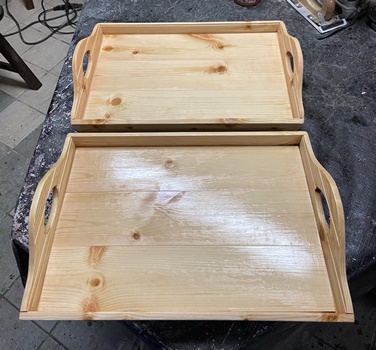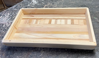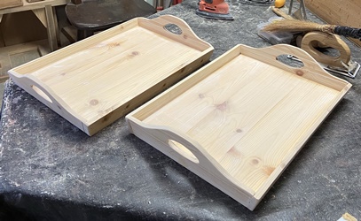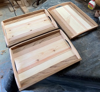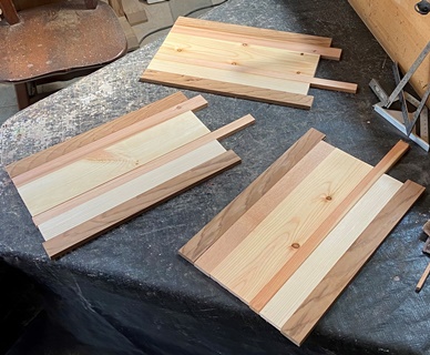このところ木のトレイは幾つもやってるけど、質感が良く便利なので人に喜ばれている。(...と思ってる。) ←左はフレームの角度を15°開いた形でやってみた試作。 どうなるかな..? と半ば手探りだったけど、案外ときれいに収まることが分かったので、下の2つを作る。