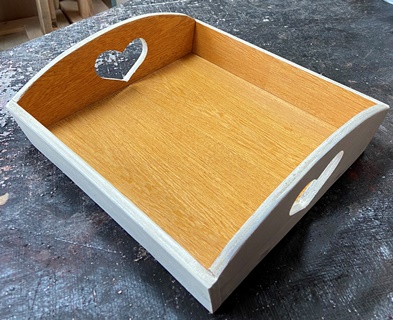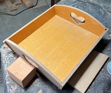 お友達にあげた木製トレイ、だいぶ使い込んでくれてたようで、落として把手部分が折れてしまったのだと。 補修いたします。 模様板のラインで縦に折り返した把手部分、矢張り弱かったようです。 今度は横ラインで付けたので、前のよりは頑丈。 猛暑、オリンピック中継、おまけにコロナワクチンの接種などあって、DIYがちっとも進まない。作業途中のもの放りっぱなしで...。(T_T)