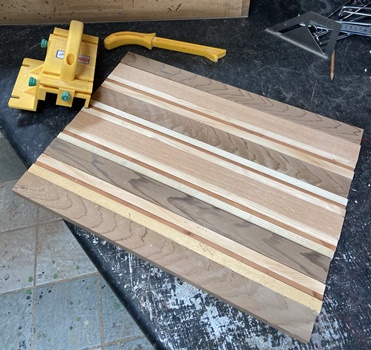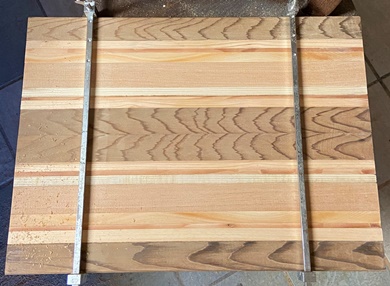 テーブルソーの縦挽きガイドを新たに作る。ついでに、グリッパーという縦挽き用の治具を導入。 アメリカで好評だというこの治具、送られてきて組み立てるのに結構骨が折れた。(T_T) 上からしっかり抑えられるので、わりと安全でいいのかも知れないが、板をプッシュする棒状のスティックなどもまだまだ出番は多くある。 で、久しぶりに模様板を作ってみる。 縦横36cm*50cm、2cm厚の模様板。 左はとりあえず並べてみただけ。