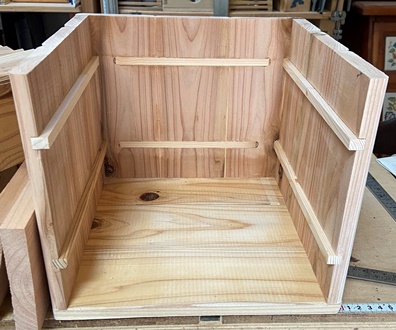 15mm厚(の杉板)なのでダボ接ぎが難しく、背面はサネ、両側面はサネ効果のガイドレールで接ぎ合わせ。 |