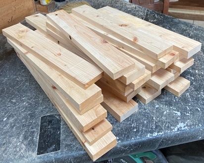 39cmから54cmほどの角材10本ほどから、木口18mm*60mmのきれいなヒノキ板が30枚できた。