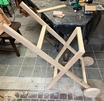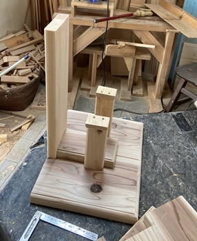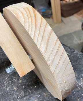 木のタイヤでやってみたくて、こんなのを製作。大型のトレースタンド。 |