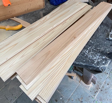 HCをぶらっと歩いてたら、ヒノキのハメ板端材の束を発見。