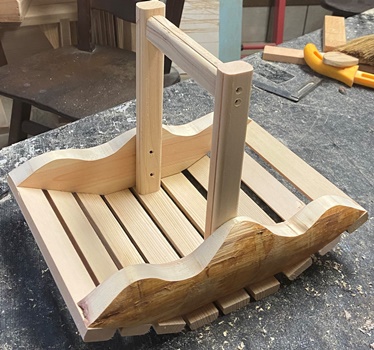 25cm*33cm、深さ9cmほどの簡単で小ぶりなバスケット。丸背の皮付きのままでも面白い。