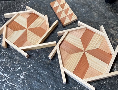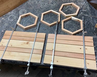 接ぎ合わせで板を寝かせている間、遊びで端切れをかき集めて1辺10cm長の六角形など作る。