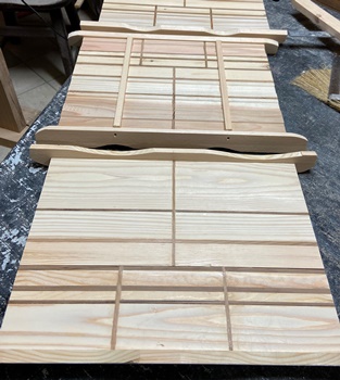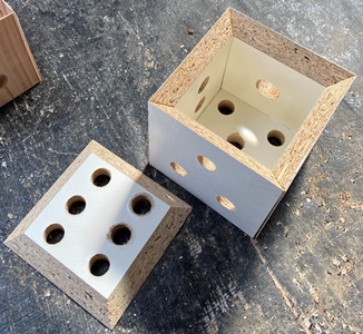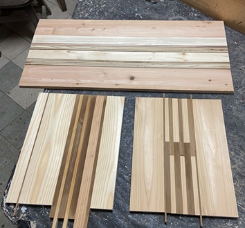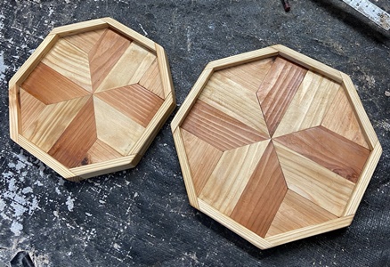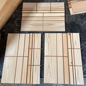 色味の違う板(杉など15mm厚)で45°カット組み合わせの遊び。