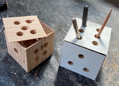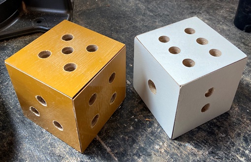 折角なのでサイコロの穴開けしたけど、最初にやった杉板だと穴がきれいにあかないのでボツ。