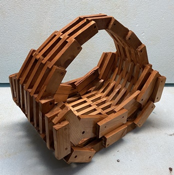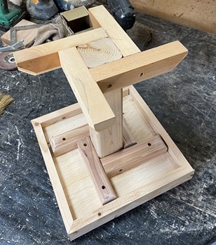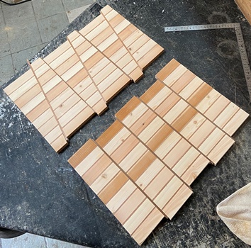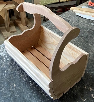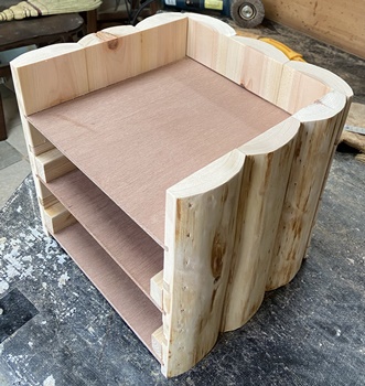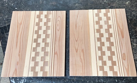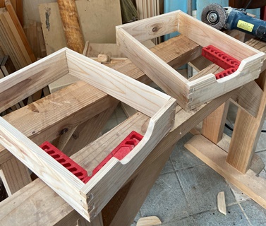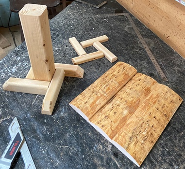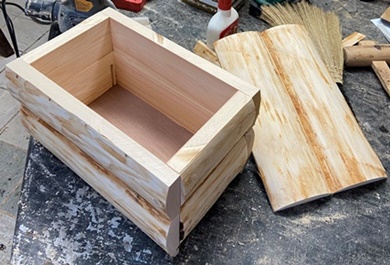 ヒノキの丸背板を使ってハコを組む。 |
