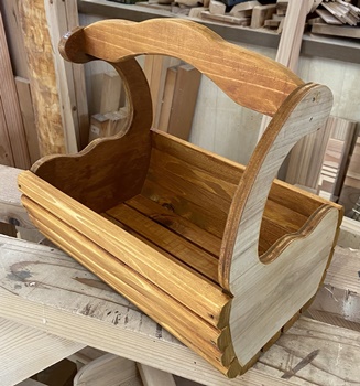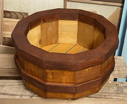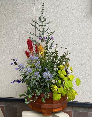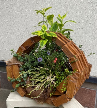 | 前に作った組み木バスケットと 12角プランターに、 奥さんが寄せ植えしてくれた。 |