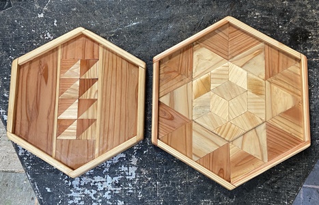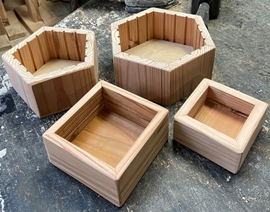 | 角度カットやった勢いで、四角形、五角形、六角形のマスを作る。(15mm厚のハメ板端材で) 四角形はサイコロ作ったのと同じに底面も45°カットで組む。ひとつだけおまけにフタなど。(^^ゞ |