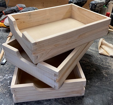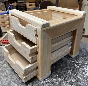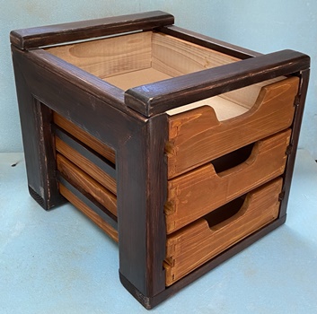| フレームはわりと格好良くまとまった。抽斗じゃなく、あくまでフレームの中の3段トレー。 削って磨いて塗って磨いて..を繰り返し、手触りのいいフレーム3段トレーができた。 ほしい..と言ってくれる人がいて、あまり埃被るまもなく(^^;)早々と嫁入り完了。 |