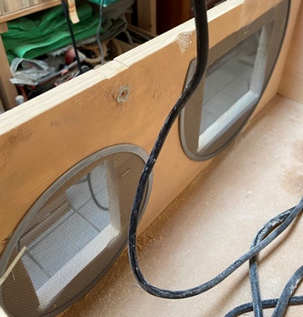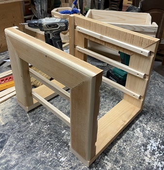 | 左上の一筆フレームに、内側でトレーを出し入れできたら格好いいんじゃないかと思って始めた。 ただ、フレーム上方の開きが寸法曖昧になるので、仕方なくフタでなく板を両端に2枚乗せて固定させる。 |