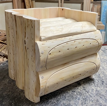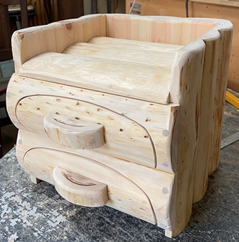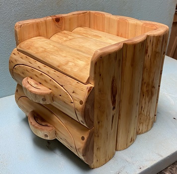| 縦横高さ約27cmの丸背のハコ。厚いところで3cmの丸背板でぐるっと囲んで、重量感がある。 抽斗把手はない方が面白そうなのだけど、つまむところがないと困るのでヒノキ切れ端で作る。 実用にも十分なるけど、自然の丸みがいい感じで、ただ置いておいても面白い質感。 |