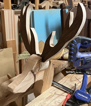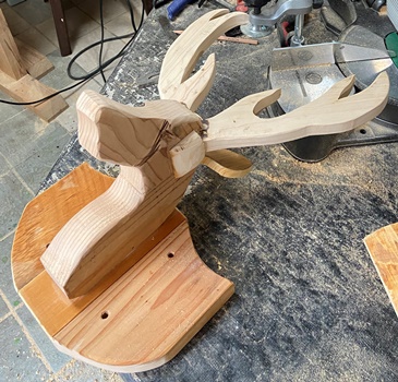 45mm厚の角材端材を、ジグソーで切り出してディスクグラインダーで削って。 角と耳は10~15mmほどの溝を掘って頭部に埋め込んだ。 削って形にするのも面白い。 取付場所は検討中。 屋外で。(^^ゞ |