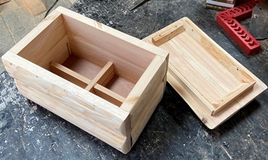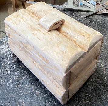 | なんか玉手箱のようなのが出来た。愛想無しなので内側に一応の仕切りを入れただけ。 縦横高さが19cm*29cm*18cmの総ヒノキの丸背玉手箱..。(何が出てくるかは分かりません。) |