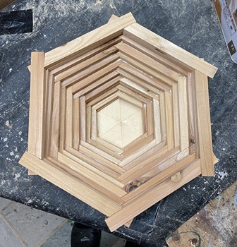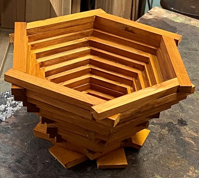 | ボンドや塗料の乾くのを待つあいだ、なにげに遊んでできた容れ物。(何を入れるかは不明) (^_^;) 片側だけ30°カットの六角形積み上げで、1辺7cmから15cmまでの11段重ね。 "など2" |