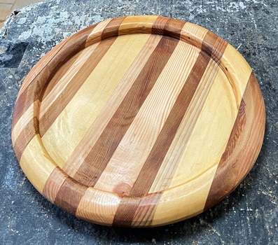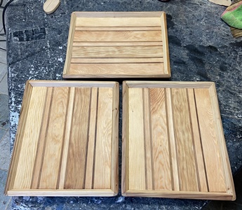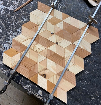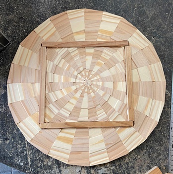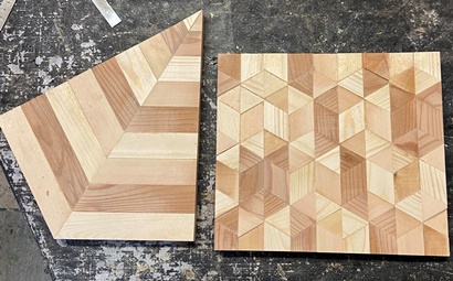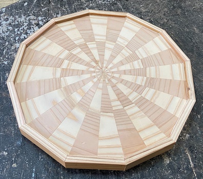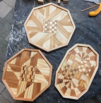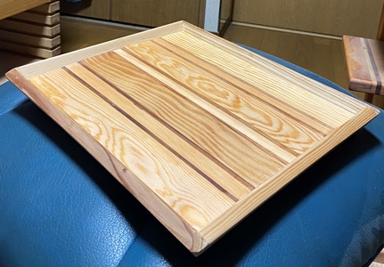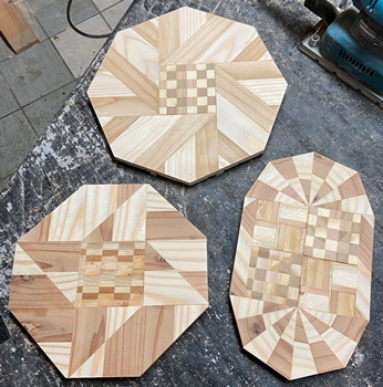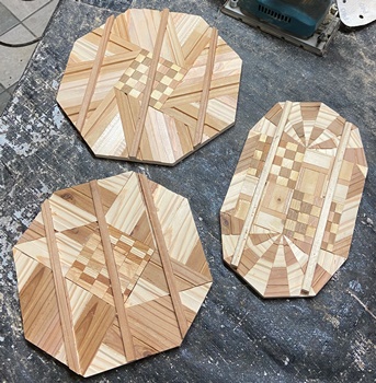 セットで作ったときの残ってたコースターを模様の中心に置いた8角トレーを3枚。 カットする角度など試しながら、どんなのができるかやってみた。裏に12mmのサネ(6mm)兼げた(6mm)。 中心が正方形なので、台形や菱形の組み合わせのようにはいかないけど、モザイク模様のまぁまぁ面白いのが出来た。 磨いて磨いて、いつヨメに行ってもいいように。(^^ゞ ちなみに上の1つが正八角形。(対角30cm)