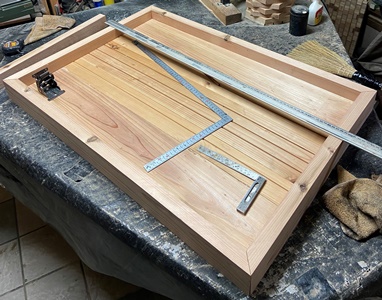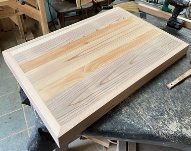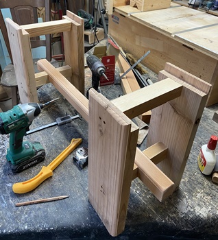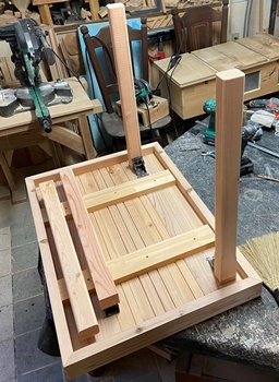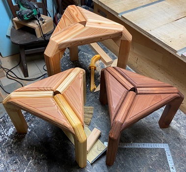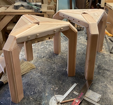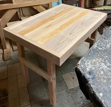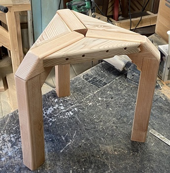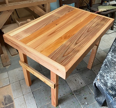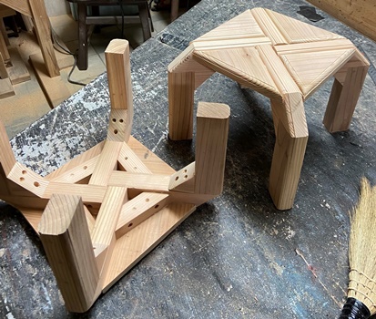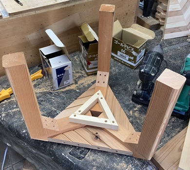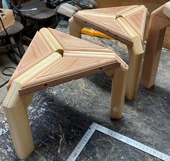 お友だちへの手土産に。 三角花台がわりと喜ばれたので、 四本脚でやってみようと。 高さが20.5cm、天板部分がおよそ22cm四方の花台。 脚は45*30mmでカットした杉、天板の三角部分は18mm厚の杉で。