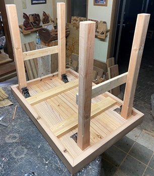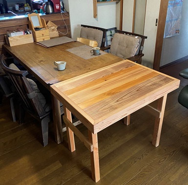 据え置きなら脚の形など工夫もできたのだけど、普段は格納しておくテーブルなので、折り畳み4本脚。 脚を干渉させずに折り畳んで収めるのにアタマをひねった。(^^ゞ