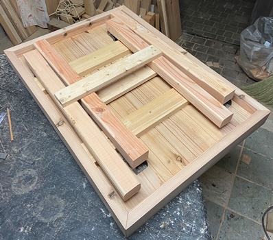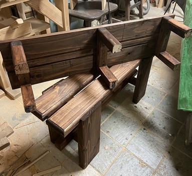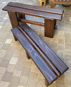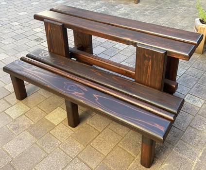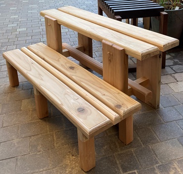 横90cm幅で40cm高と20cm高のステップ。 あとの利用を考えたら、階段式の一体型よりも セパレーツの方がいいだろうと。 3cm厚の杉板を天板にして、脚は杉板横使いと 45mm角の松材。 40cm高の脚組みはちょっと工夫。 すっきりガッチリとしてわりときれい。(^_^)v 屋外で置きっぱなしになるのだろうから、 防腐入りウォルナットで2度塗り。