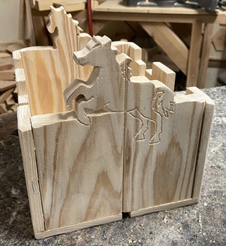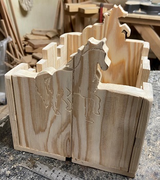 リス、コアラ、ウマを切り出してみて、一息つく。 3つほど作れる材料はカットしてあるのだけど、 まだあと1つ分残ったまま。 実用的な小物整理ハコだけど...もぅひとつ。(*_*) フェンス面に飾り文字でも入れたら、 アクセントになっていいのかな..?