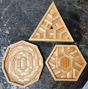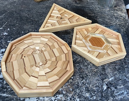 あまり実用的じゃないけど、小さめの多角形トレーを3つ。 六角形やっててカットした余りで出来たのが三角形。(^^;)
