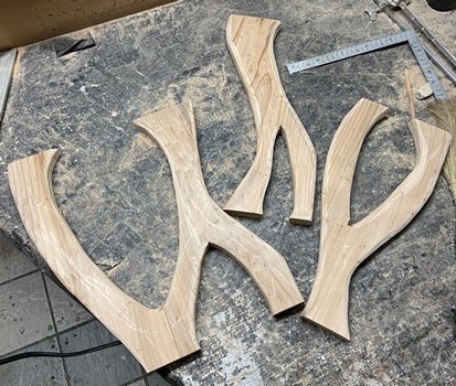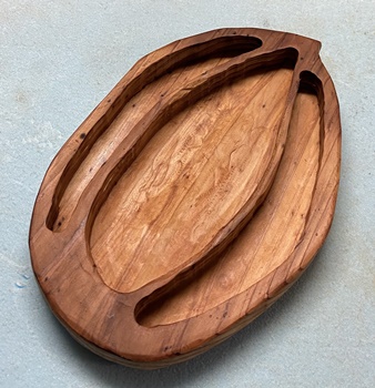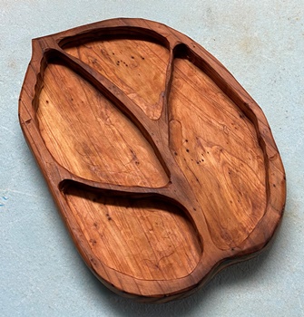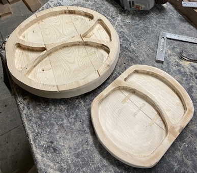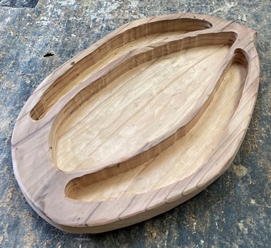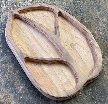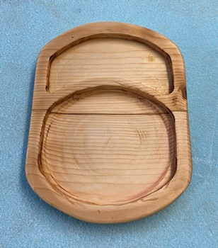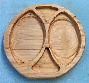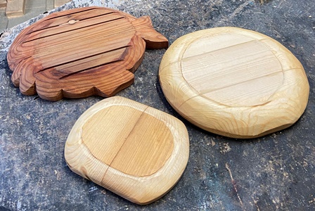 削り木皿、3cm厚のカフェ板を約20*30cmサイズでカットして、デザイン性のあるのを..と。 |