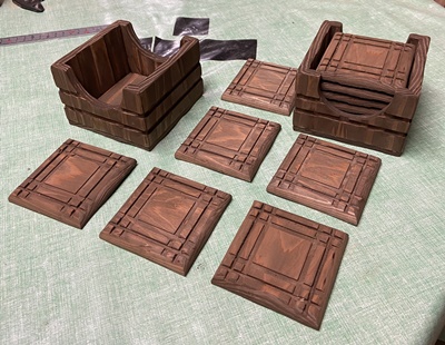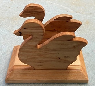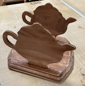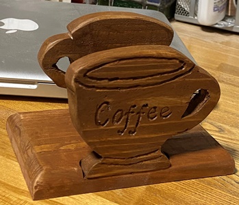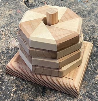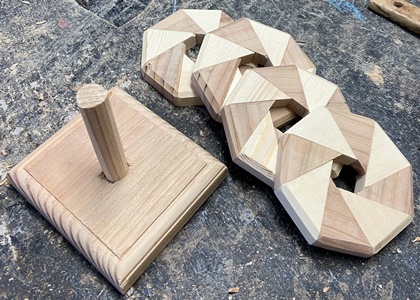 | 直近でやった壁掛け板の製作ででた三角形端切れ。 ドーナツ状の八角形にしたのを棒を通してセットに。15mm厚でコースターにしてはちょっと。(^^;; |