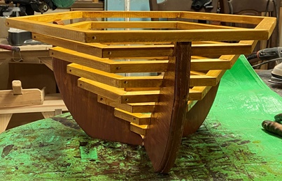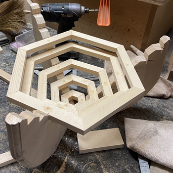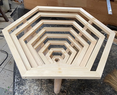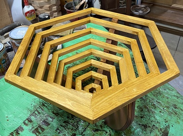 | 6角リングを八層。底が1辺4cm、上段が1辺27cmの6角リング。 上段の対角53cm、高さ27cmのバスケット。脚の斜辺に溝を入れるのには四苦八苦。 |