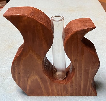 | 3つめは穴を開けるんじゃなく、凹みで挟み込む形で。試験管はどれも12cm長。 面白いイメージで出来たけど、(季節のせいもあるけど)花がない一輪挿しでちと愛想なしの写真。m(_ _)m |