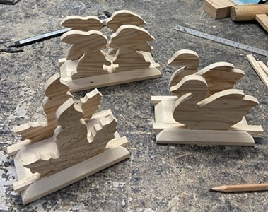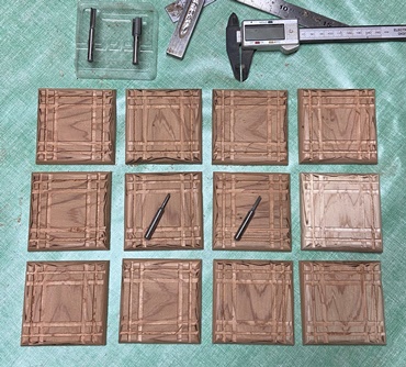 | まず2つ。厚さ4~4.5cmの杉板使って。(25mm径の)穴開けはカットする前に。 | |