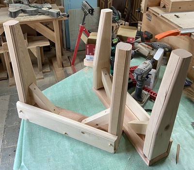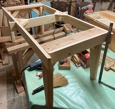 | 部屋のスペースをうまく使って、天板にものを並べたり足下をスッキリさせておきたいとのご希望から。 縦横60cm*120cm、高さ45cm強の片付けテーブル。わりと大きい。まずは脚組みをしっかりと。 |