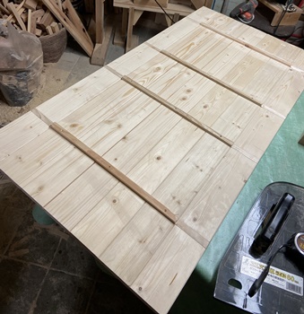 | こちらのお宅のリフォームで余ったという材をたくさんいただいたのだが、 使いたかった24mm厚の杉を使うと重くガッチリし過ぎるので、天板はSPF材 1*4 の接ぎ合わせでやる。 裏側の4本サネは、接ぎ合わせを固定させるだけでなく、天板を脚枠にはめ置きする形にしてみた。 |