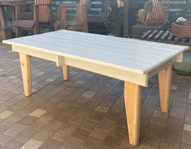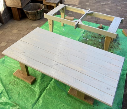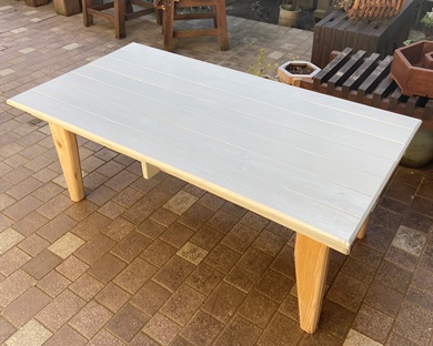 | 脚組みと天板がセパレーツのテーブル完成。喜んでもらえたようで嬉しいことです。 油性のライトグレイ、仕上がってみるとなかなかいい味が出せてる。(^_^)v |
