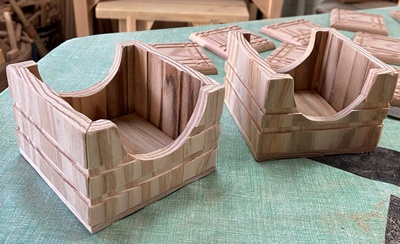 38mm厚の2*4 SPF材と24mm厚の松。 28*27cmの深さ28mmと19*15cmの深さ17mm。 |