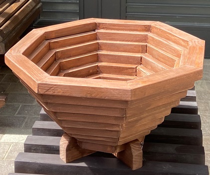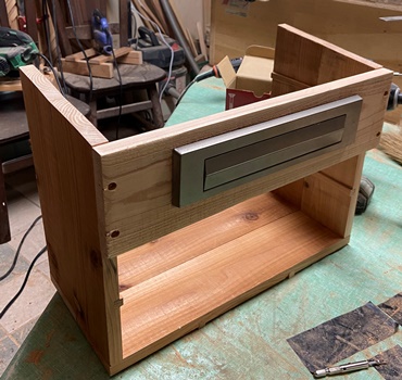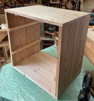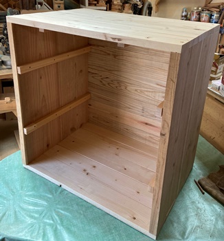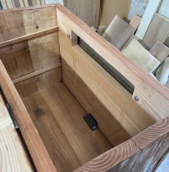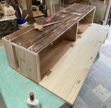 | 材料はほぼ全てを杉の15mm厚と18mm厚で作業。防腐効果のある水性チークで仕上げ。 上開きの天板も何か飾りがあってもと考えたけど、雨水が溜まりそうなので止め。 |
