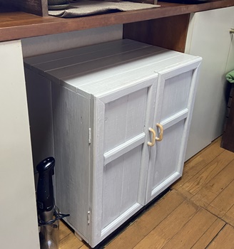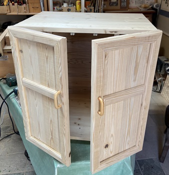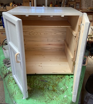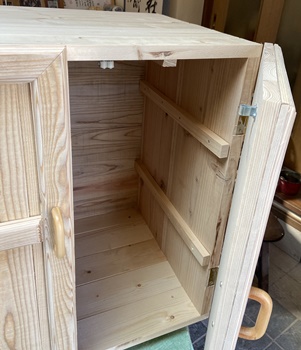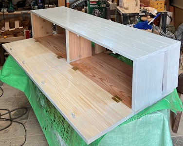 | 元からので残ったのは天板だけ。前面扉は、蝶番とローラーキャッチで半分ずつガッチリ取り付け。 天板に塗ってあったウォルナットも、削って磨いて、油性のライトグレイを上塗りする。 |
