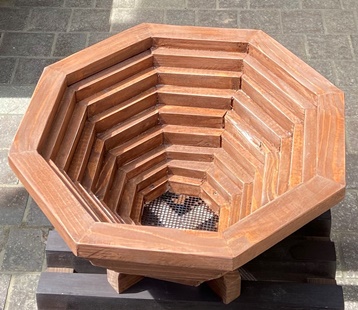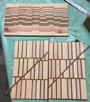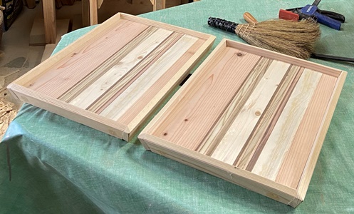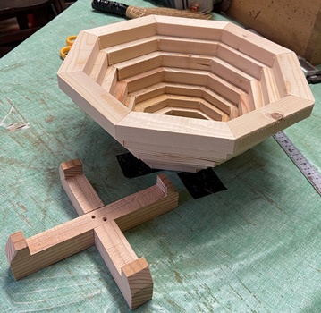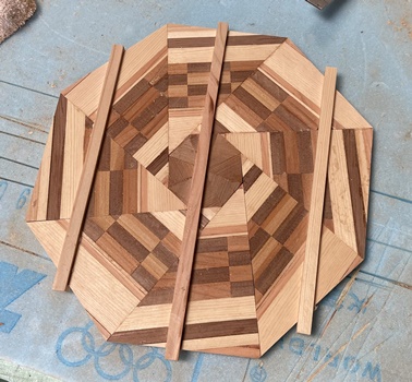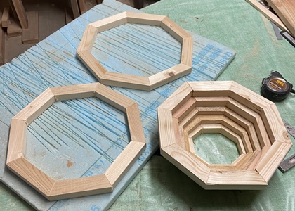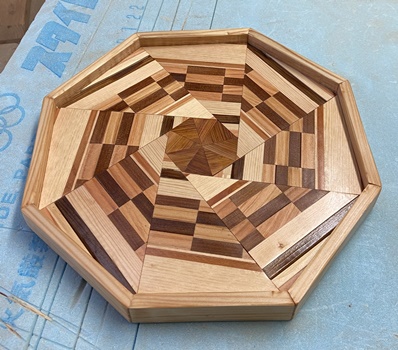 | 中心部の八角形はレッドシーダで埋める。裏面サネは中心も通したことで3本。 対角32cmの八画トレー。わりときれいなんじゃないかな..と思ってます。(^^ゞ |