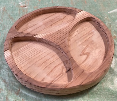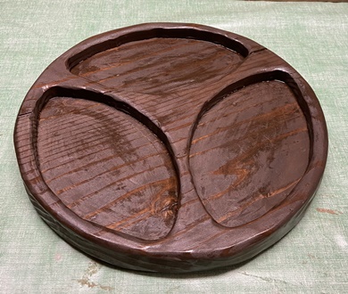 | 3cm厚のカフェ板、直径およそ30cmの円形トレー。深さ17mmで削る。 水性のウォルナット色オイル+透明ニス仕上げ。着色オイルが今ひとつ。ペイントしたのが良かったかも。 |