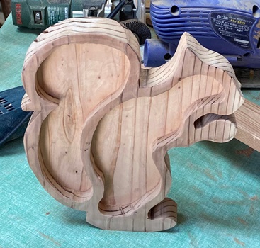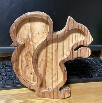| こちらも3cm厚カフェ板で。縦横およそ23*20cm、深さ16mmほど。 リスのトレー、可愛いらしいので立てるようにもする。チークオイル仕上げ。 |