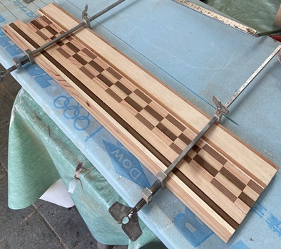 | 15cm幅、60cm長の接ぎ合わせ。これを45°カットして直角二等辺三角形を8枚。 並べ方は、これもいろいろ考えてみたけど、中心穴空きの八角形で。 |