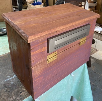 | DIY始めた頃に作ったポスト、合板などを多く使っていたせいで雨ざらしには辛かったようです。 金具の差込口と前扉のマグネットキャッチはそのまま、設置場所も同じなので造りは前とほぼ同じ。 |