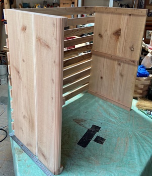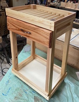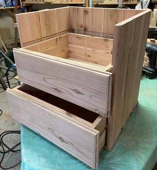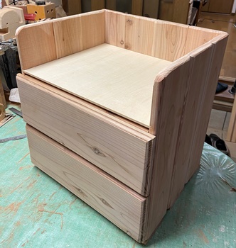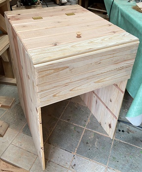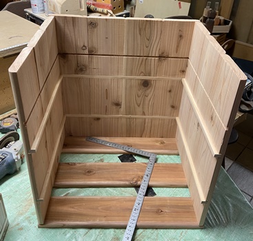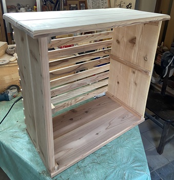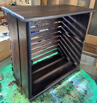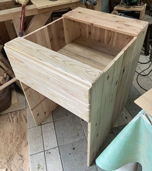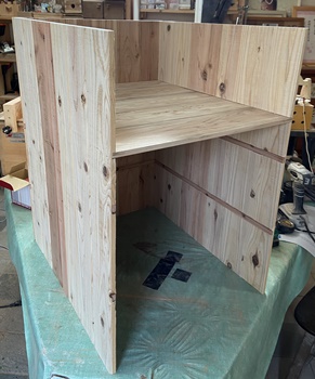 構造は単純だけど、大きさと重量物を乗せる関係から、 両側板と天板底板に24mm厚の杉、背面のスノコ状板に18mm厚杉で組んで、強度をしっかりとれるように。 ペイントは水性ウォルナットの2度塗り。 |