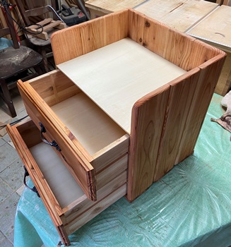 ほぼ希望寸法どおりでまとまった小物入れボックス。チークオイル仕上げですっきりまとまった。 喜んでもらえて、早速使ってもらってるようで嬉しいです。(^_^)/~ |