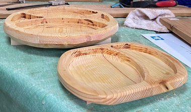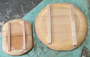 | 前に削り木皿をいくつか作った中で、接ぎ合わせ板でやったショッカー?木皿など。 裏にサネ&ゲタ履かせることで接ぎ合わせ面の(将来)不安を解消する。 これなら誰かに心配なくあげられるな...と思っていたら、早速もらって行かれました。^^ |