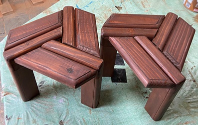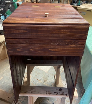 | いい艶もでて、きれいでガッチリしたのが出来た。 早速、生ビールをご馳走になって美味かったけど、背面スノコを前面に使うのがいいらしい。(^^;) |