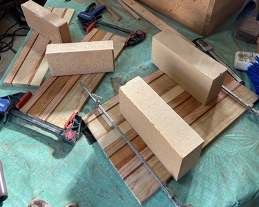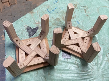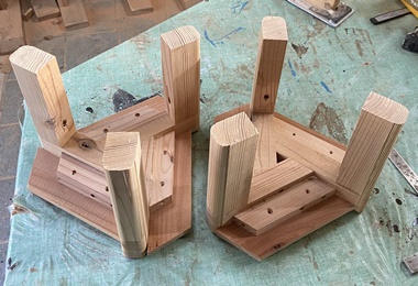 | 斜めカットで5mm幅のレッドシーダー材を挟んでみたけど、垂直の方が落ち着き感があったかも。 松、杉などの接ぎ合わせだけど、まぁまぁきれいには収まった。 |
