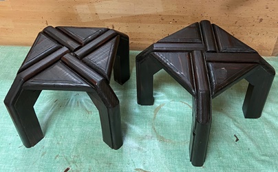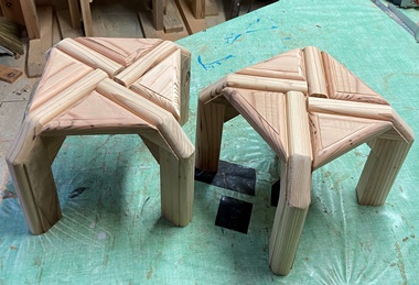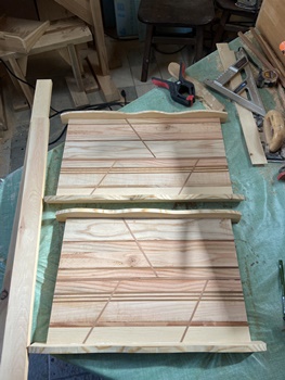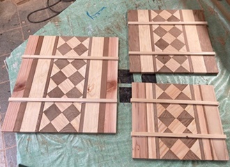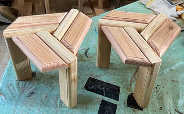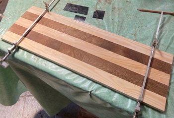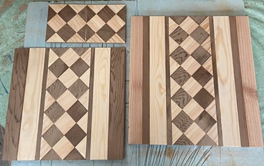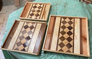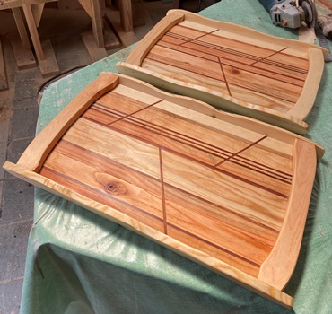 頼まれモノの製作が続いていたので、端材残材かき集めて、縞模様のデザイントレーを2枚。 底面のサイズが 縦27cmで 横40cmと45cmの 2つ。 |