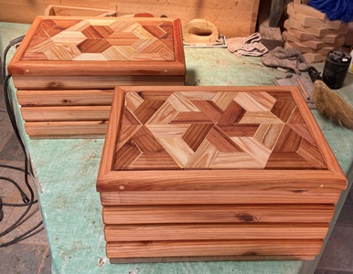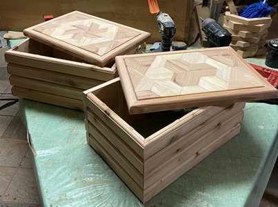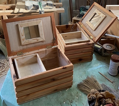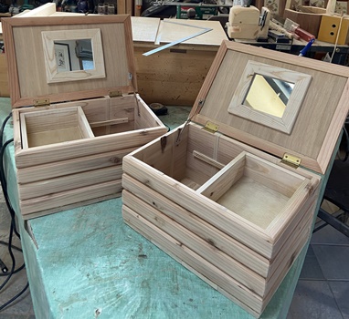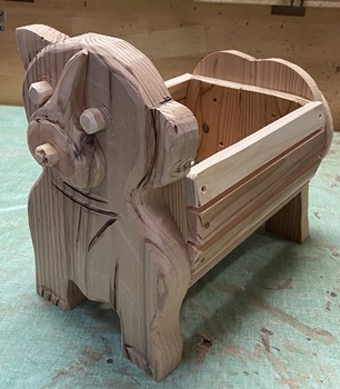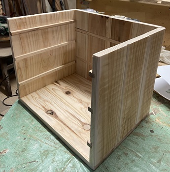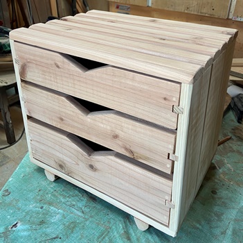 | 仕上がり寸法が、縦横高さ25*36*20cmとたっぷり感のある小物入れ。 チークオイル仕上げできれいに収まった。 |